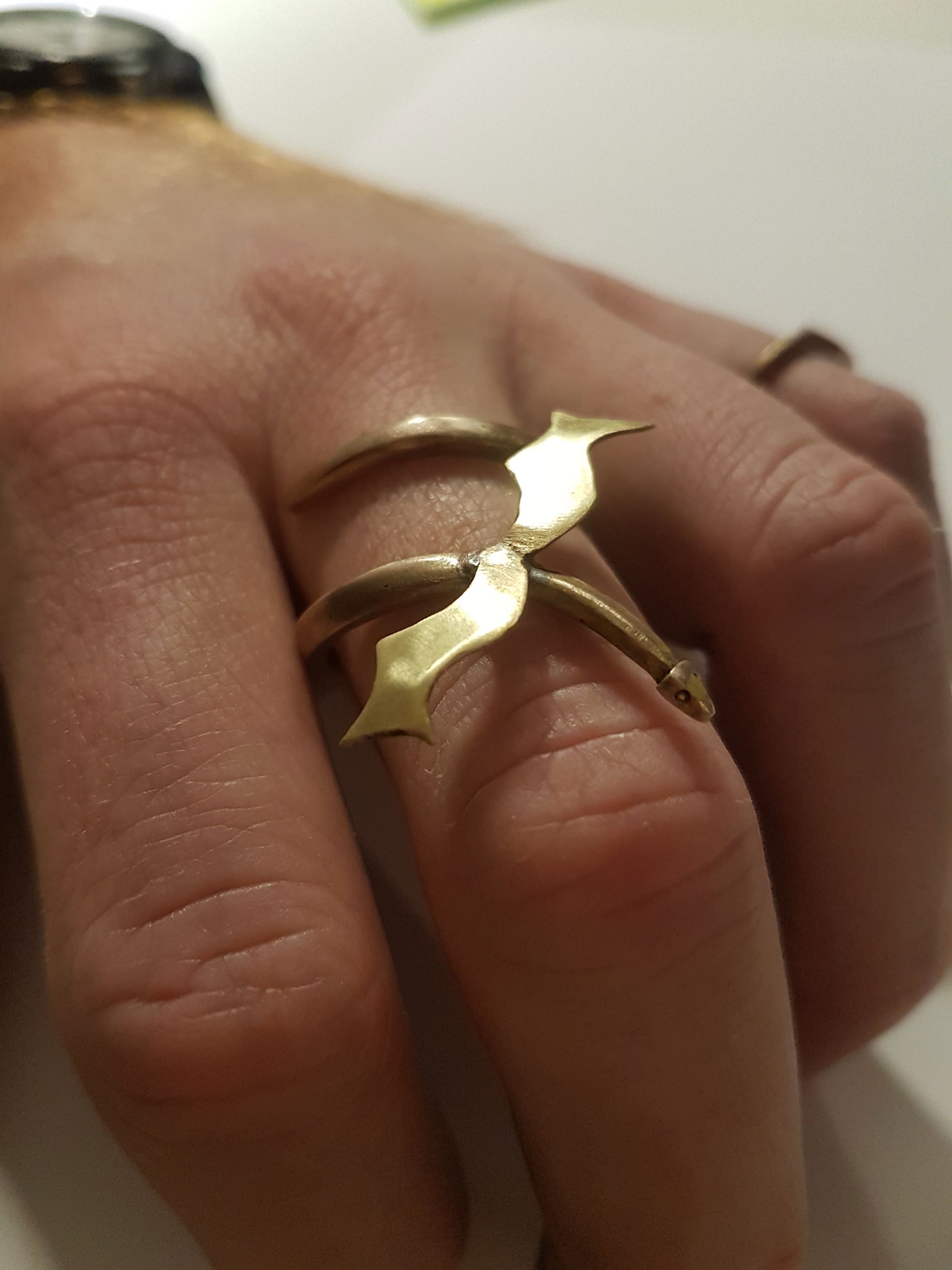 Ein Drachenring aus Messing, der sich um den Finger schlängelt. Wie sich herausgestellt hat, sind die Flügel eher schön als nützlich, da man sich da häufig daran verletzt.