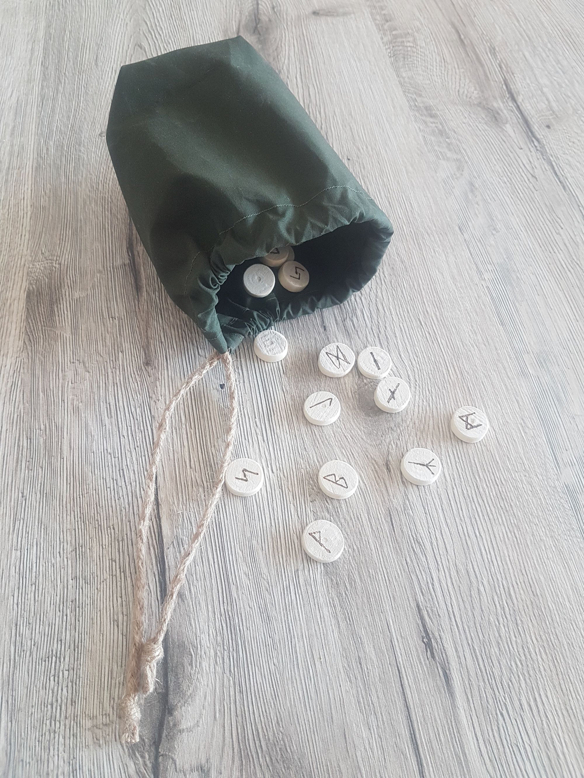 Runen und ein passender Runenbeutel. Die Runen wurden selbst zurechtgesägt und geschliffen. Der Runenbeutel ist ebenfalls selbst genäht.