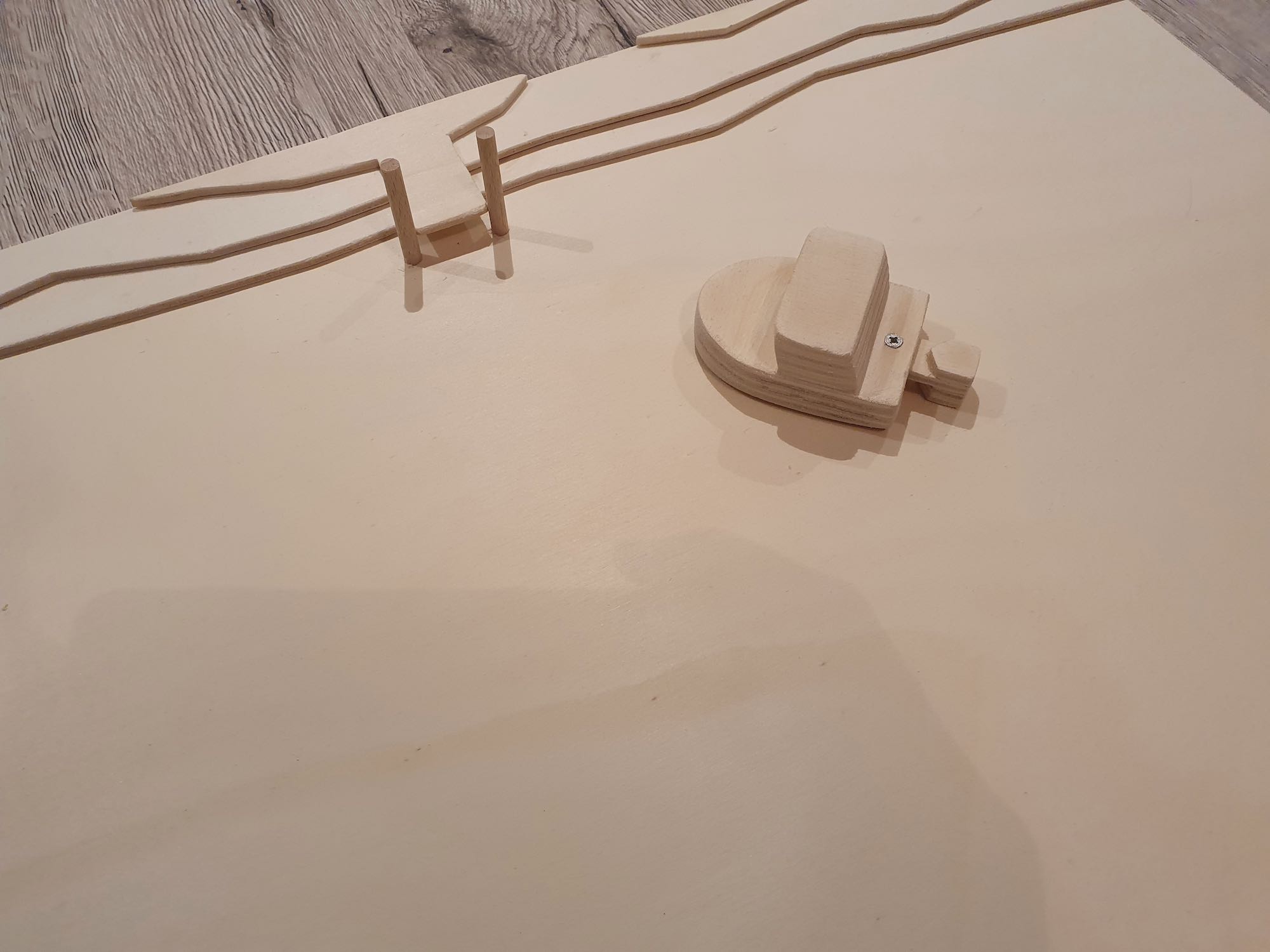 Ein Modellschiff inklusive Steg, um Manöver zu verbildlichen.